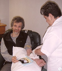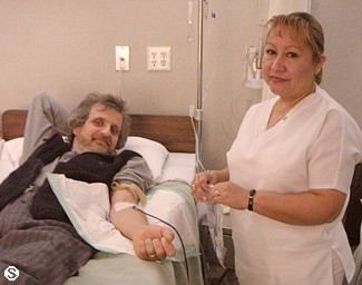 After the walk I was back to my duties... nurse Betty (see photo) started the IBC Ultraviolet Irradiation of the blood treatment. A pint of blood is let out in a bag and then is returned into the vein after having being treated with Ultraviolet Irradiation in a special box (see photo - this pic will also go in my "self-portrait collection"). I always have plenty of data for you to read: click here for Ultraviolet Irradiation article. For lunch I only had a fresh salad. I passed on the steamed vegy and Wild Rice. Still for the same breakfast considerations. Eileen has been busy trying to get a date for the delivery of the IBC Dendritic Cell Vaccine. My blood was sent to the lab that prepares the vaccine December 22 and the vaccine should return next week. As soon as we receive it we can flight back to Canada. I receive the third chemotherapy (Fluorouracil or 5FU 250 mg. dose). I start Week 13 (IBC Hospital & Liver Detox - 5-9 Jan, 2004).