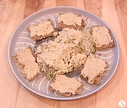 A nice lunch... RAW CRACKERS (see above) with raw SUNNY PATE (Sunflower seeds, Lemon juice, Scallions, raw Tahini, liquid Aminos, Red Onion, Parsley, Garlic, Cayenne Pepper, Ginger juice and Cumin) server with raw RED CLOVER SPROUTS covered with raw BASIC PATE (Sunflower seeds, Lemon juice, liquid Aminos and Garlic). What a great LUNCH.