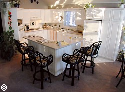- Family room and Kitchen with bar, breakfast area, and hot tub in cathedral ceiling setting.