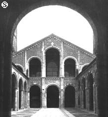 | Built by Saint Ambrose, the Patron Saint of Milan and dedicated to the Martyrs whose bones rest beneath its alter, the original Basilica dates back to the fourth century. In true Milanese style, the church was added on to and modified by following generations. In the 9th century, an elaborate alter of gold and silver leaf, studded with jewels and enamel, is a tribute to the master goldsmith Volvinio. The bell tower on the south was constructed in the 9th century, and the north tower added in the 12th century. |