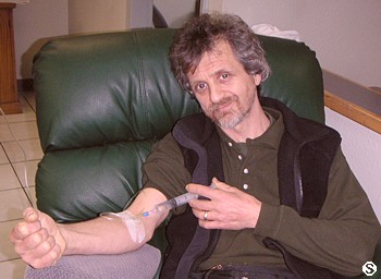 After the walk I was back to my duties... nurse Betty (see photo) started the IBC Ultraviolet Irradiation of the blood treatment. A pint of blood is let out in a bag and then is returned into the vein after having being treated with Ultraviolet Irradiation in a special box (see photo - this pic will also go in my "self-portrait collection"). I always have plenty of data for you to read: click here for Ultraviolet Irradiation article. For lunch I only had a fresh salad. I passed on the steamed vegy and Wild Rice. Still for the same breakfast considerations. Eileen has been busy trying to get a date for the delivery of the IBC Dendritic Cell Vaccine. My blood was sent to the lab that prepares the vaccine December 22 and the vaccine should return next week. As soon as we receive it we can flight back to Canada. I receive the third chemotherapy (Fluorouracil or 5FU 250 mg. dose). I start Week 13 (IBC Hospital & Liver Detox - 5-9 Jan, 2004).