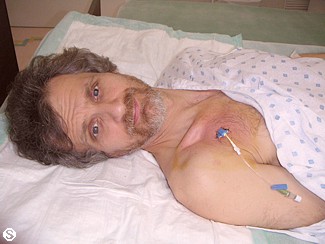 Sat 3 Jan : I had a good sleep. I can tell that was also because of yesterday sedation. After breakfast and a little walk, I was back into the Hyperbaric Chamber (6th treatment). We finally managed to talk to Dr. Henriquez. Next Monday I will have IBC Ultraviolet Irradiation of the blood (about one hour treatment). During the week I will have injection of IBC Live Cell Therapy. (I already forgot the details about it). As for the chemotherapy (Fluorouracil or 5FU) 500 mg. were administerd in each Whole-Body Hyperthermia, now he is thinking to give me another 250 mg. a day for 5 days. This is a very low dosage so I should be safe from side effects. The only marks on my body are the two small holes at the top of my legs (see photo) that allow the insert of tubes into my arteries and veins. The blood flows out of my body into the heat exchange machine and then back into my body through the other hole. The holes are about 1/8 of an inch.
