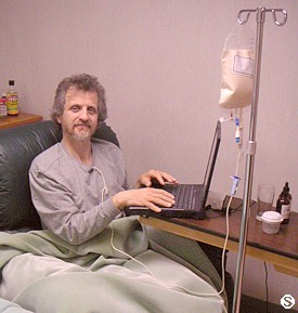 Tue 30 Dec : Gail did not make it... we had sensed this was coming, but one can always hope for a miracle right up until the end. Eileen and I have plenty of memories of our own on the subject (Randy & Cora). We are so happy to have walked on their path and helped them make some important decisions, like moving into this hospital and get proper care and focus on enjoying these last moments. They were also going to Dr. Castillo clinic and they had started a few days before us. Also for them the answer wasn't there. IBC doctors and staff made the difference for Gail situation. Gail had no intention to go... she had kept talking for days about going back to Canada... then slowly the illness (cancer) took over. Her daughters will take her ashes back to Canada. I am working away. I always set my office in the most strange places (see photo). New blood work is ready: Hematology and Chemistry. It shows that I am back to be a little anemic, and that was expected because of the Whole-Body Hyperthermia. My dinner was great... steamed broccoli... and steamed fish. Eileen knows how to add flavor with saltless spices and liquid aminos. My appetite is good. On another topic My testicle skin peeled off like over roasted turkey. A direct effect of Whole-Body Hyperthermia along with a burning sensation when urinating. For now this is all I can report. But then on Friday I get the same treatment and we will see. Monday I had a chamomile enema done by a nurse and really loosen me up. I seated all day on the toilet and today the same. So here is the dilemma: constipation or diarrhea ? What is best to wish ? ;-)